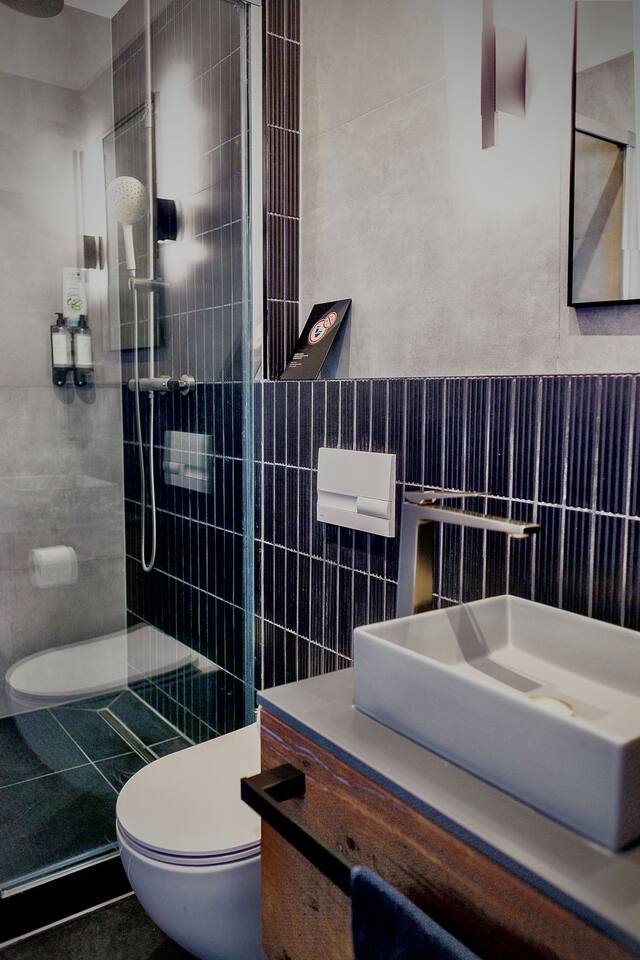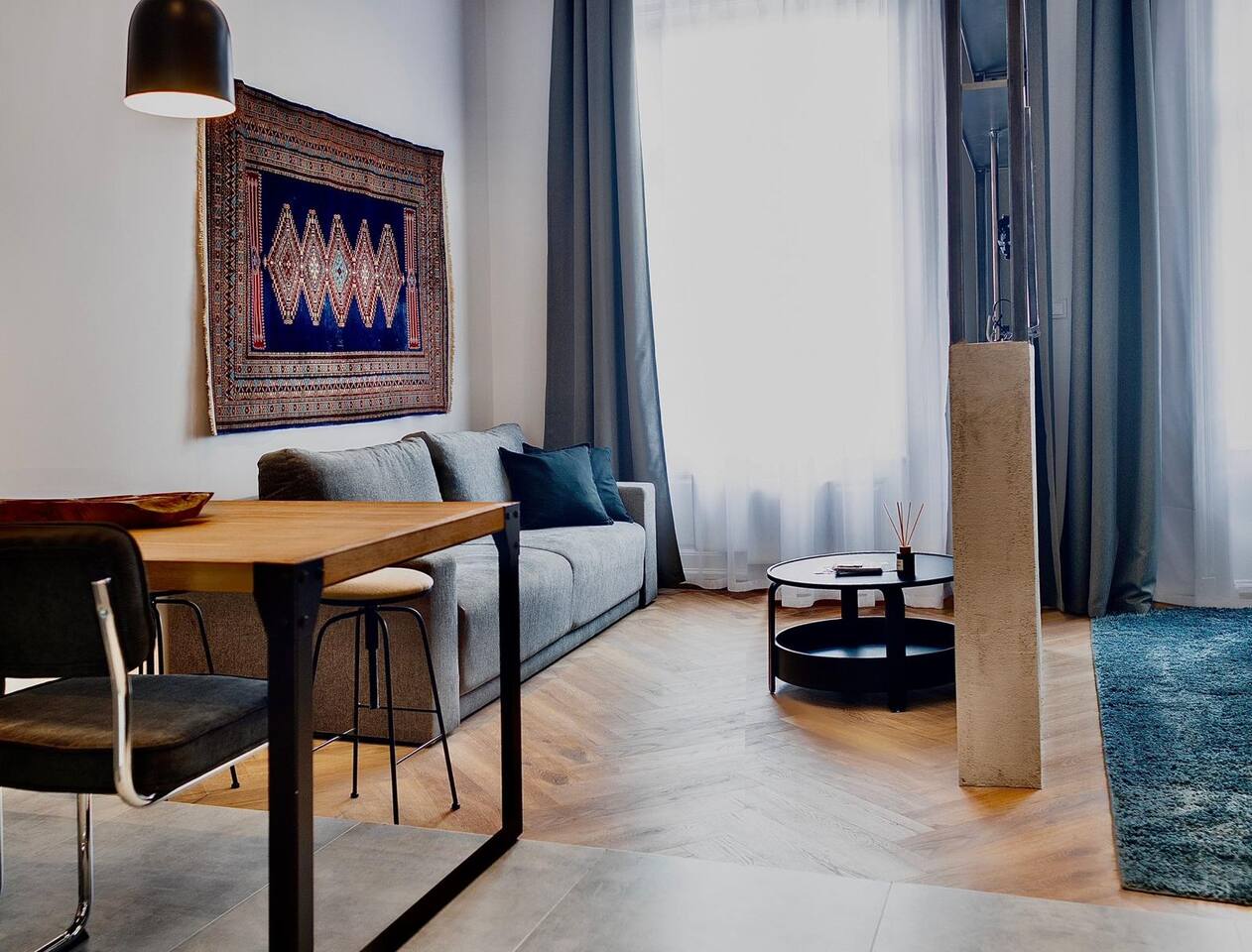 Ebben a 34m2-es szobában akár négy vendég is alhat, kihúzható kanapéággyal. Mindenütt egyedi dizájnmegoldások jellemzik a szobát, az egyedi készítésű konyhától kezdve a forgó tévétartóig, amely lehetővé teszi a nyugodt nézelődést a nappali és a hálórészben egyaránt. A fürdőszobában van egy zuhanyzó, amely ugyanolyan tompa tónusokban pompázik, mint a belső tér, ahol egy afgán perzsaszőnyeg és retro magyar poszterek adnak színt és karaktert. Az utcára néző ablakoknak köszönhetően minden természetes fényben úszik.