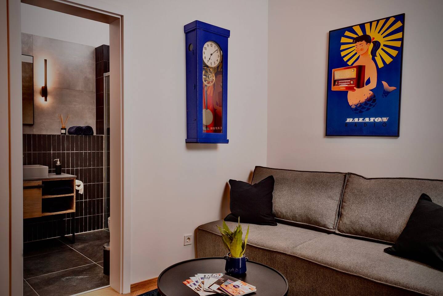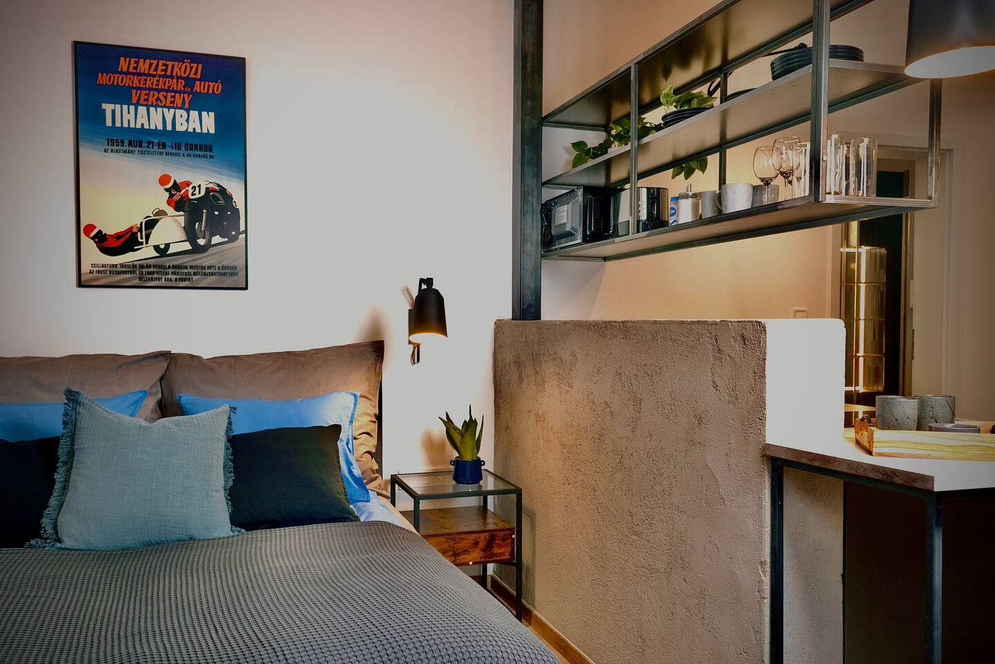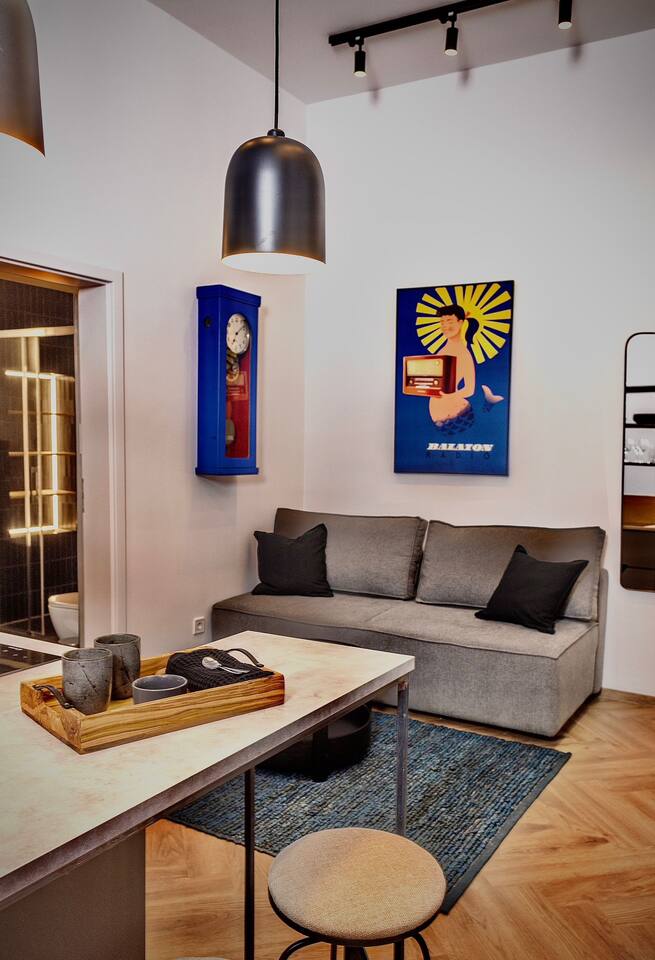 Ez a 25m2-es, saját bejárattal rendelkező szoba kihúzható kanapéágyával akár négy vendéget is elszállásolhat. Az ízléses szürke és fehér árnyalatok között retro magyar poszterek adnak színt, az ablakok pedig a békés belső udvarra néznek. A magas színvonalú konyha egyedi készítésű kellékekkel rendelkezik, míg a fürdőszobában a nagyméretű, sétálós zuhanyzót gyors vízlefolyás emeli ki.